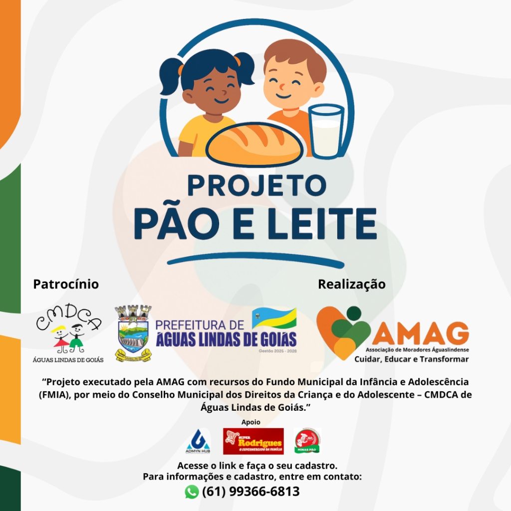 O Projeto Pão e Leite é uma iniciativa da Associação de Moradores Aguaslindense (AMAG), executada com recursos do Fundo Municipal da Infância e Adolescência (FMIA), por meio do Conselho Municipal dos Direitos da Criança e do Adolescente (CMDCA) de Águas Lindas de Goiás, com apoio da Prefeitura Municipal.